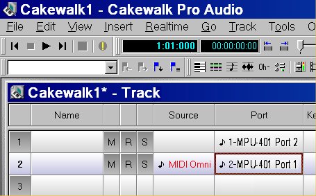 Assume that you have a MIDI interface that has two independent busses (ie, 32 MIDI channels). The first bus happens to be named "MPU-401 Port 1" and the second bus is named "MPU-401 Port 2". (These names are determined by the manufacturer of the interface, and set when you install the interface's driver). Above, we have assigned the first track of Cakewalk to output of the second port, and the second track to output of the first port. This means that even if we use MIDI channel 1 for both tracks, they will actually be different channels. After all, track one is using MIDI channel 1 on port 2. Track two is using MIDI channel 1 on port 1, which is an entirely different channel.